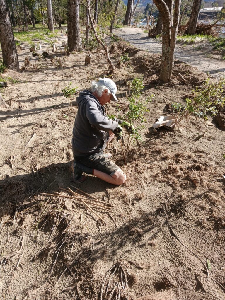With gloves on and small trowels at the ready we gently revived each plant, rubbing off clumps of debris tightly wrapped around stems & branches, removing mud from leaves & snuggling roots back into the soil. Plant guards full of sand were removed & the plants were staked upright ish again.